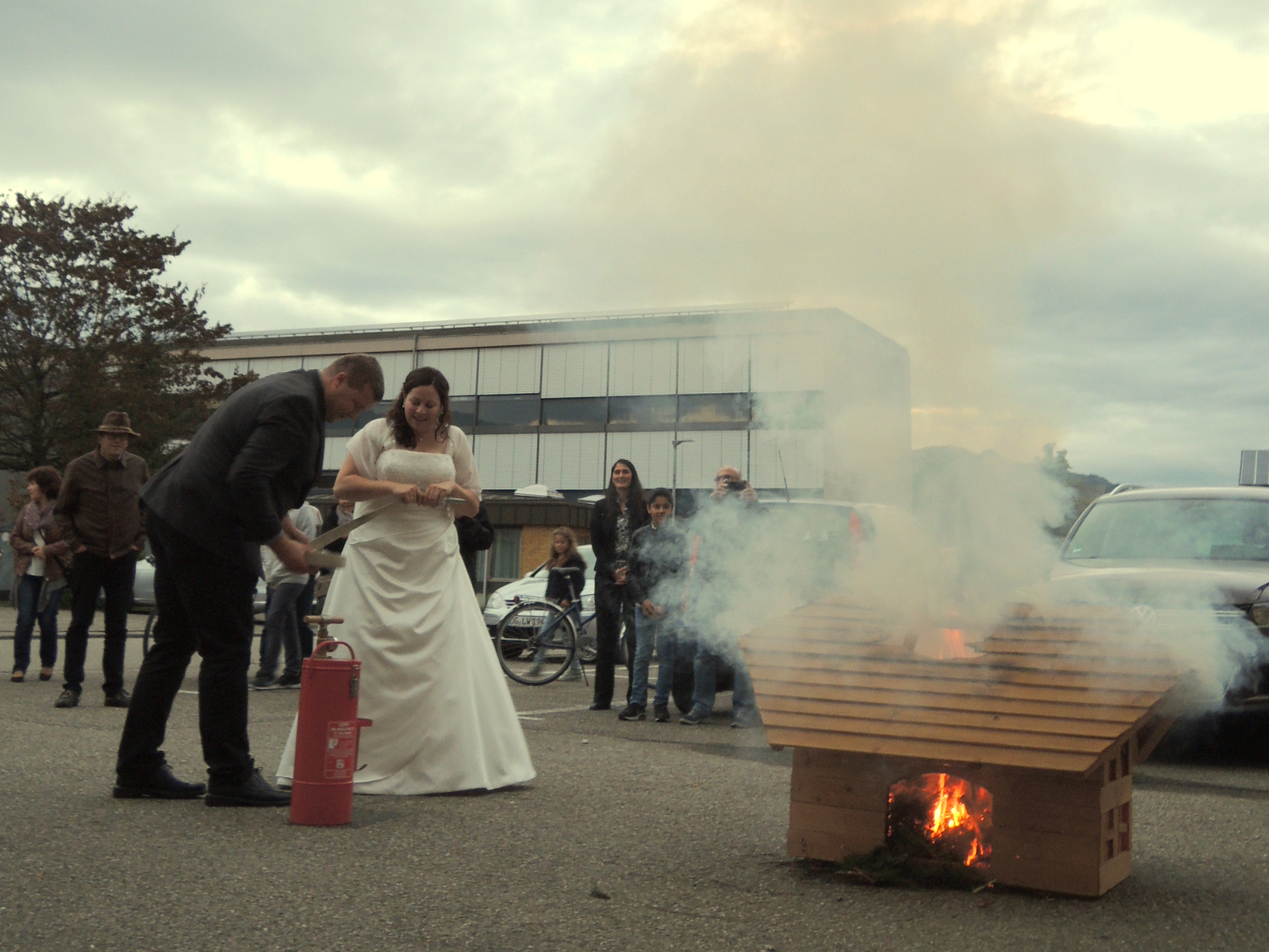 Am vergangenen Samstag 1. Oktober sagten die Steinacher Christian Maas und Julia Metzger Ja zueinander. Im engsten Familienkreis wurde die standesamtliche und kirchliche Trauung in Steinach vollzogen. Als das Brautpaar nach dem gemeinsamen Mittagessen sich in ihr ausgesuchtes Hotel zurückzog verbreitete sich die Nachricht der Trauung in Steinach wie ein Lauffeuer, da nur wenige Familienangehörige von dem gemeinsamen Schritt der Beiden wussten. Die Vereine, in welchen die beiden aktiv sind stellten am Sonntagabend auf die Schnelle einen Empfang auf die Beine. Die Schwendiger Hexen und DLRG wo die Braut aktives Mitglied ist, sowie die Narrenzunft und Feuerwehr Abt. Steinach wo der Bräutigam aktives Mitglied ist standen Spalier bei der Ankunft der Beiden in Steinach. So mussten sich die frisch Vermählten auch noch im Löschen eines Gebäudebandes beweisen- was mit Bravour gemeistert wurde. Stellvertretender Abteilungskommandant Markus Decker wünschte der jungen Familie Maas alles Gute auf Ihrem neunen, gemeinsamen Lebensweg. Im Anschluss wurde gemeinsam im Narrenkeller gefeiert.