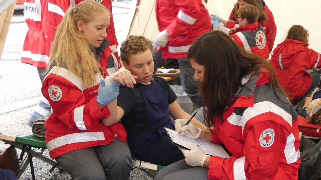 Unweit des Übungsobjektes hatte das Rote Kreuz in einem schnell aufgebauten Zelt eine Verletztensammelstelle eingerichtet. Blutende Wunden oder Verletzte unter Schock wurden dort behandelt.