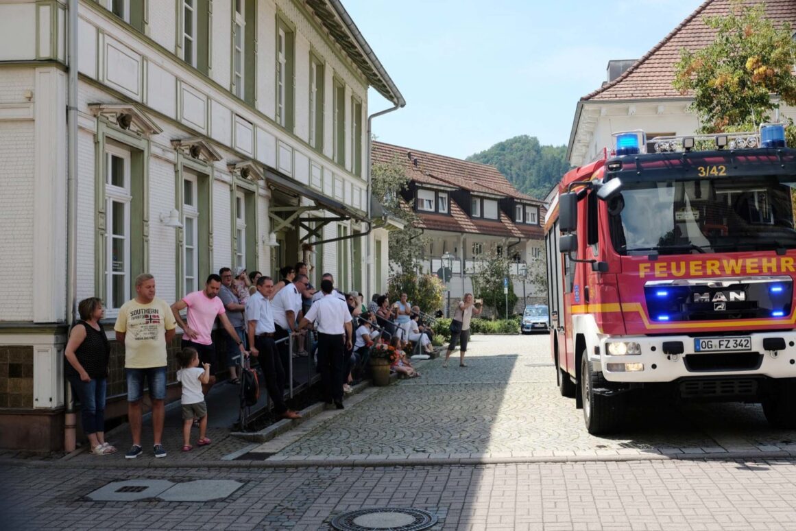 Als die Fahr­zeu­ge ein­tra­fen, war­te­ten bereits zahl­rei­che Schau­lus­ti­ge vor dem »KUZ«. Trotz des Alters der Ein­satz­kräf­te – die 40 Jugend­li­chen aus Zell und Stein­ach waren zwi­schen 10 und 16 Jah­re alt – wirk­ten die nöti­gen Hand­grif­fe rou­ti­niert. Zusam­men mit den 15 »gro­ßen« Feu­er­wehr­leu­ten wur­de der Ein­satz­be­reich abge­sperrt, Pum­pen auf­ge­stellt, um die Was­ser­ver­sor­gung aus dem Bach auf­zu­bau­en, Schlauch­lei­tun­gen ver­legt und ver­letz­te Per­so­nen aus dem Gebäu­de gebor­gen – alles als rei­nes Übungs­sze­na­rio natür­lich und weni­ger mit Blick auf die benö­tig­te Zeit als viel mehr mit sehr viel Erklä­rung und Hin­blick auf die rich­ti­gen Abläu­fe. Mit dabei war auch der Zel­ler Bür­ger­meis­ter Gün­ter Pfund­stein. Er hat­te sich die Zeit genom­men, um bei der Abschluss­übung der 24-Stun­den­ak­ti­on per­sön­lich dabei zu sein. Er zeig­te sich beein­druckt, in welch gro­ßer Zahl der Feu­er­wehr­nach­wuchs bei bes­tem Som­mer­wet­ter die 24-Stun­den­ak­ti­on dem Schwimm­bad vor­zog, und führ­te Gesprä­che mit der ein oder ande­ren Nach­wuchs­kraft. Als Dan­ke­schön lud er im Namen der Stadt alle Teil­neh­mer nach der erfolg­reich absol­vier­ten Abschluss­übung ins Eis­ca­fé Vene­zia ein.