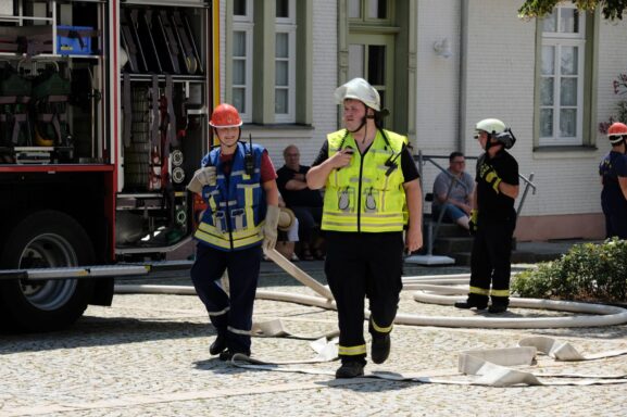 ent­ge­gen­zu­tre­ten ent­schie­den sich zurück im Feu­er­wehr­haus alle für eine gro­ße Was­ser­schlacht. Der Vor­platz des Gerä­te­hau­ses wur­de zum Schau­platz des Spek­ta­kels – mit allem, was dazu gehört. Selbst vom Kom­man­dan­ten wur­de dabei nicht halt gemacht. Nach einer Mit­tags­stär­kung war dann die Abschluss­übung am Kul­tur­zen­trum dran, an die sich das Abschlus­sessen mit Schnit­zel, Spätz­le und Soß’ anschloss.