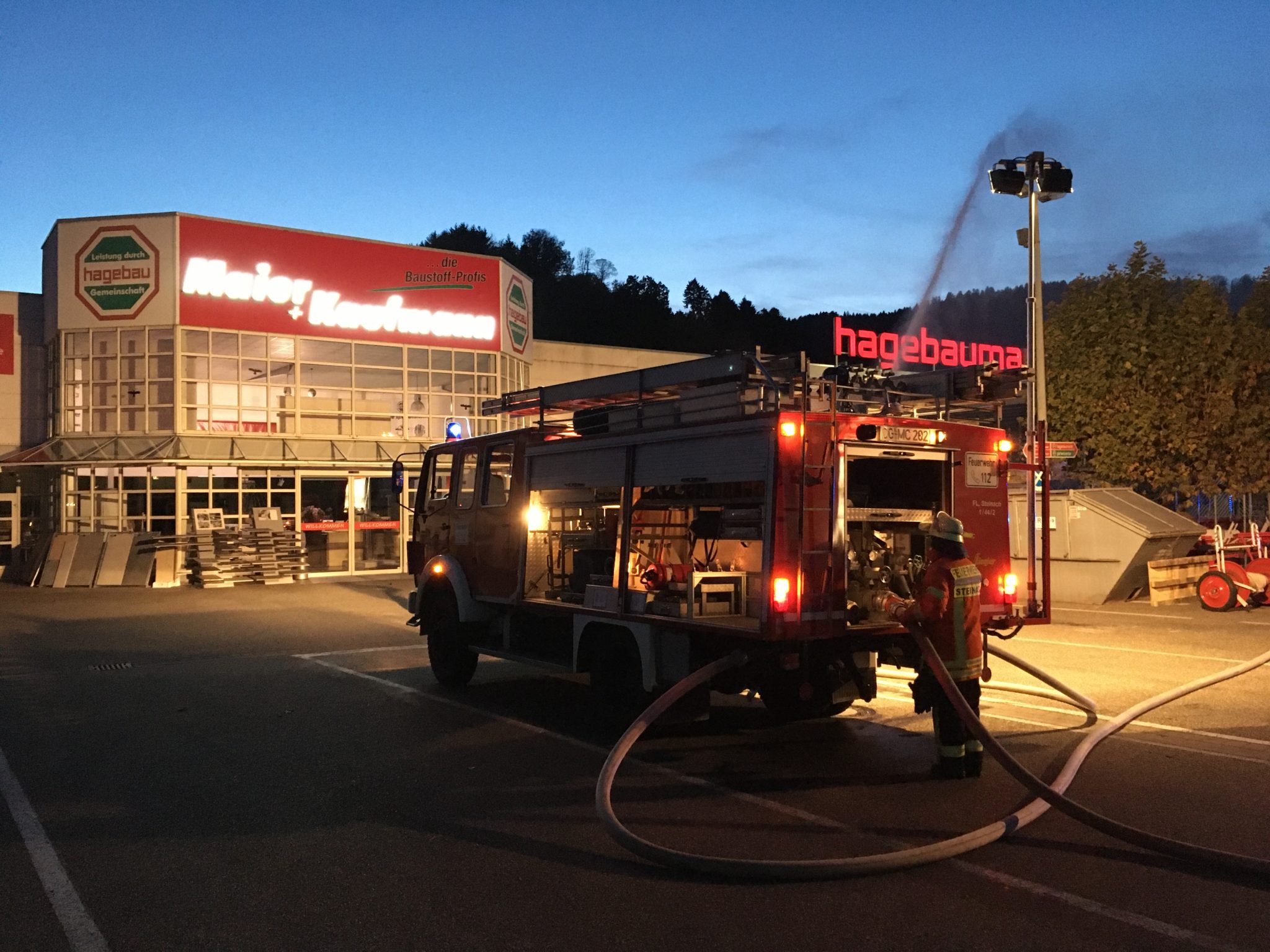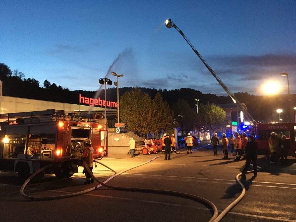 Die Steinacher Feuerwehr hatte sich in diesem Jahr Hagebaumarkt/Maier und Kaufmann als Übungsobjekt ausgesucht. Beginnen konnte diese am Samstag allerdings erst nach Schließung des Marktes um 18 Uhr. Diese Herbstabschlussübung wurde dann in nächtlicher Abendstunde zu einer ganz besonderen Herausforderung.