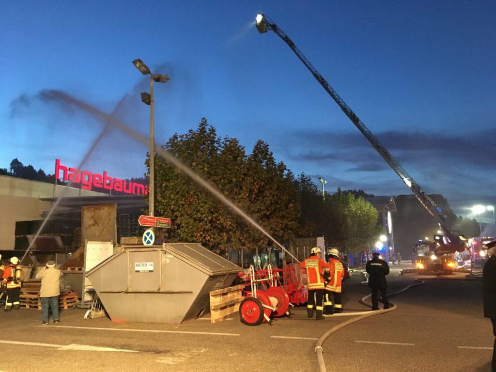 Angenommen wurde, dass die Mitarbeiter nach Ladenschluss beim Zählen der Kassen Brandgeruch bemerken. Den Brand im Bereich des Außenlagers selbst zu bekämpfen, sei misslungen. In diesem Bereich lagern unter anderem Gasflaschen, Briketts und Pellets.