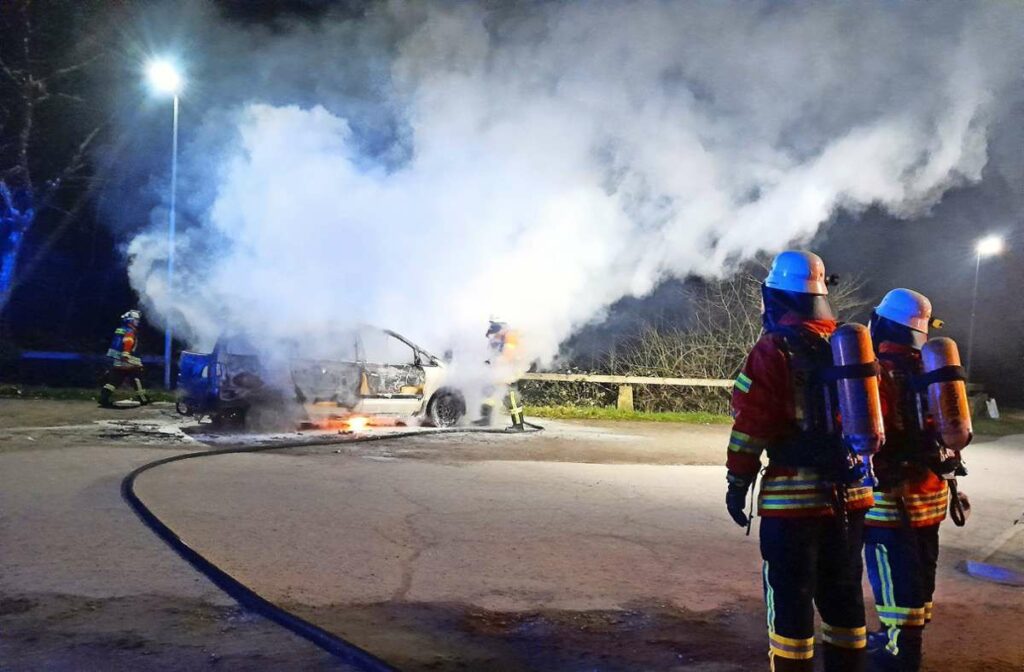 Beim Eintreffen der Feuerwehr stand das Auto bereits in Vollbrand, schreibt Schriftführer Markus Halter. Atemschutzträger der Steinacher Wehrleute löschten das Auto ab und kühlten es, sodass es abtransportiert werden konnte. Im Einsatz war die Feuerwehr mit zwei Fahrzeugen und 15 Einsatzkräften. Die Polizei geht davon aus, dass ein Defekt in der Fahrzeugelektronik die Ursache des Feuers ist. Verletzt wurde demnach niemand.